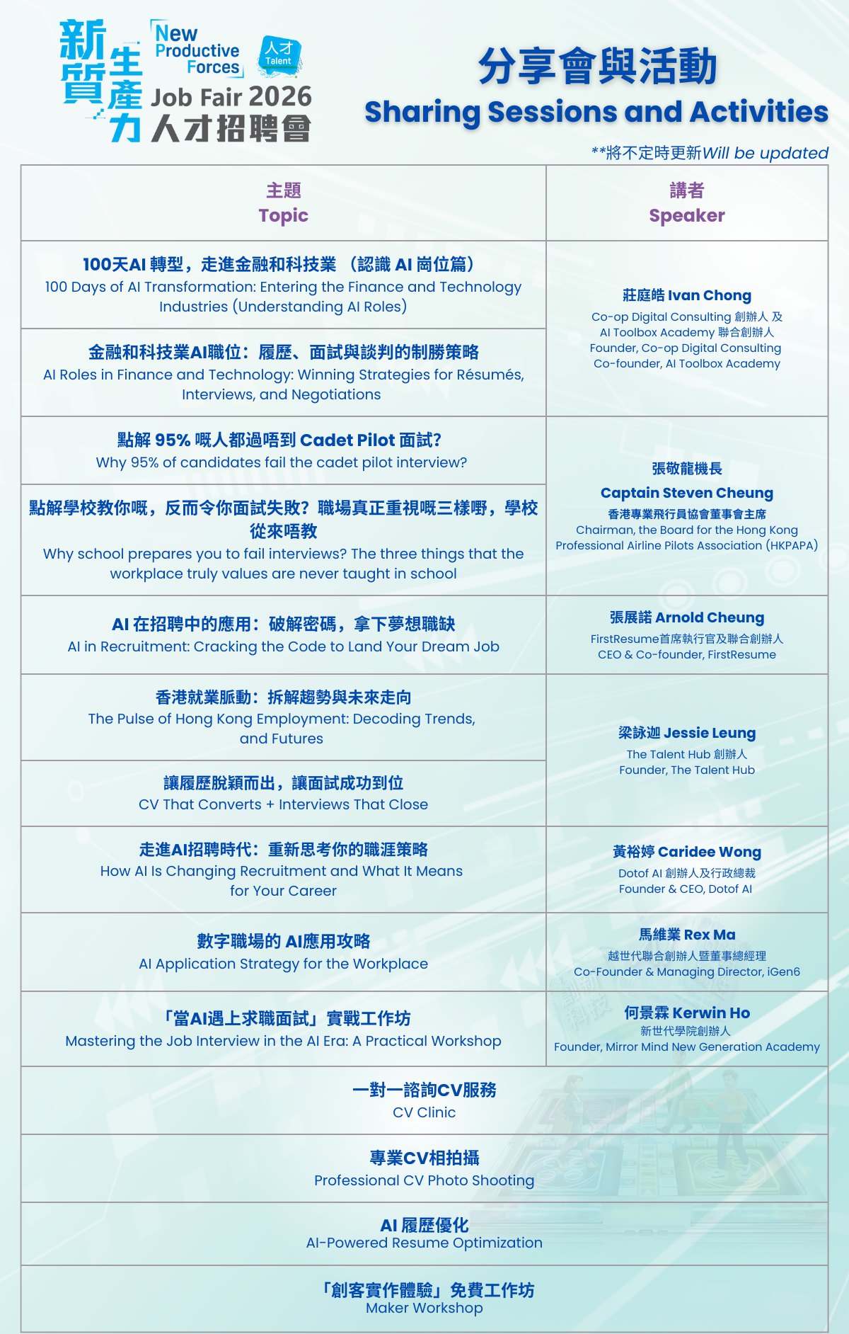- 實戰互動工作坊:AI履歷優化、一對一諮詢CV服務、專業CV相拍攝、「創客實作體驗」免費工作坊