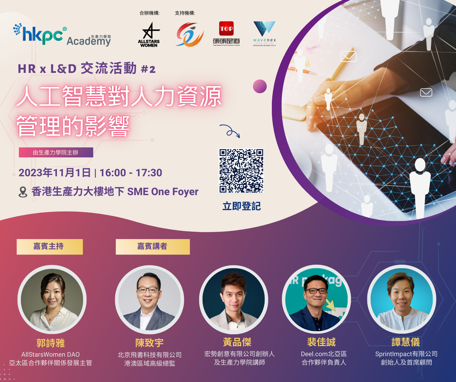 生产力学院再次举办「HR x L&D 交流活动」,让从事人力资源、学习及发展工作的人士、 培训导师及人才顾问,了解人才发展的最新趋势及策略,从而提升企业竞争力及生产力!是次活动将分享及探讨最新科技趋势,如何应用人工智能提升人力资源顾问的工作效率及打造更个人化的员工体验。